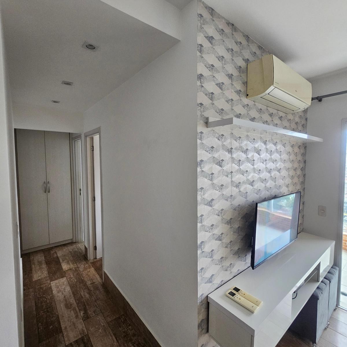 Corredor com home office e armário embutido